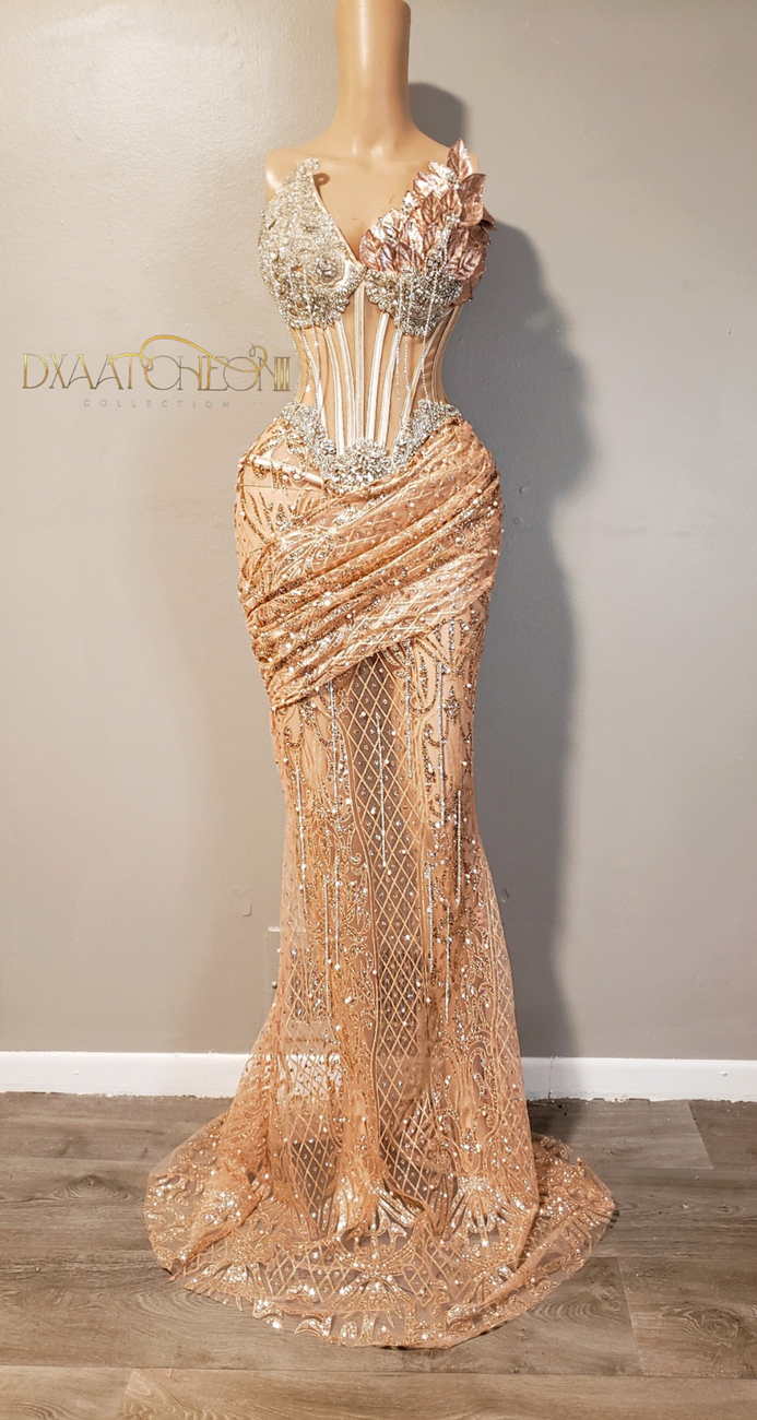 Rosegold corset gown with 3d left petals, drapping and crystal bling. The bottom is a pearl beaded train. Upper back is lace up.