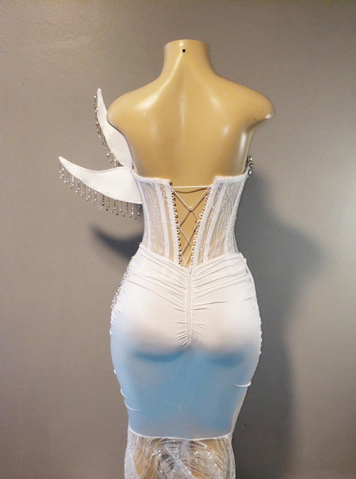 Custom white lace corset gown with silver and white crystal lace, mirror pieces and a slit. Back is lace up.