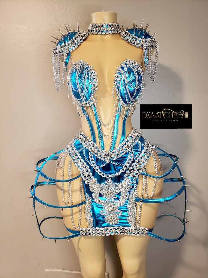 Custom dress. Perfect for birthday, red carpet, stage performances. Hand placed custom bling with hand placed spikes and chains. Most definitely a head turner.