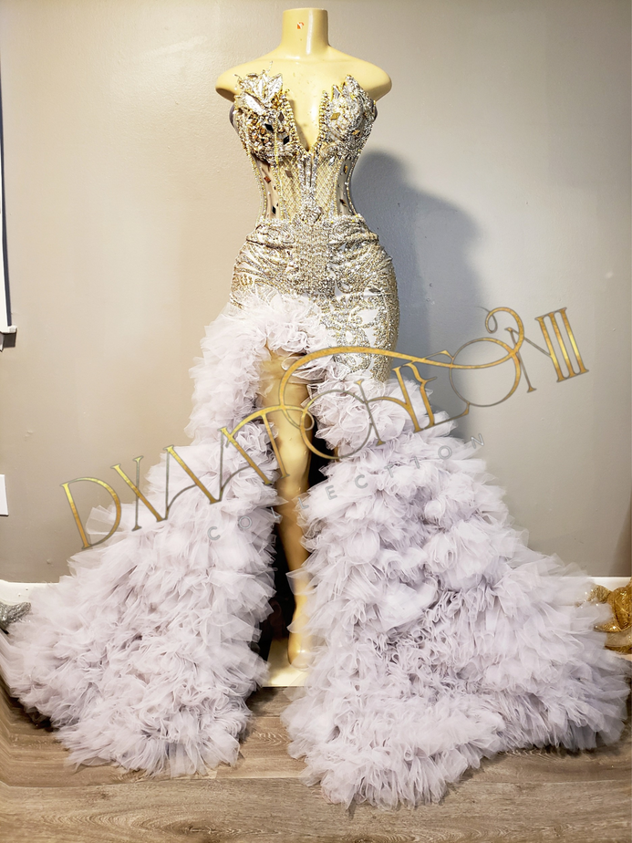 Custom silver corset gown with hint of gold bling mirror pieces and gems; with silver/grey ruffle slit mermaid bottom.