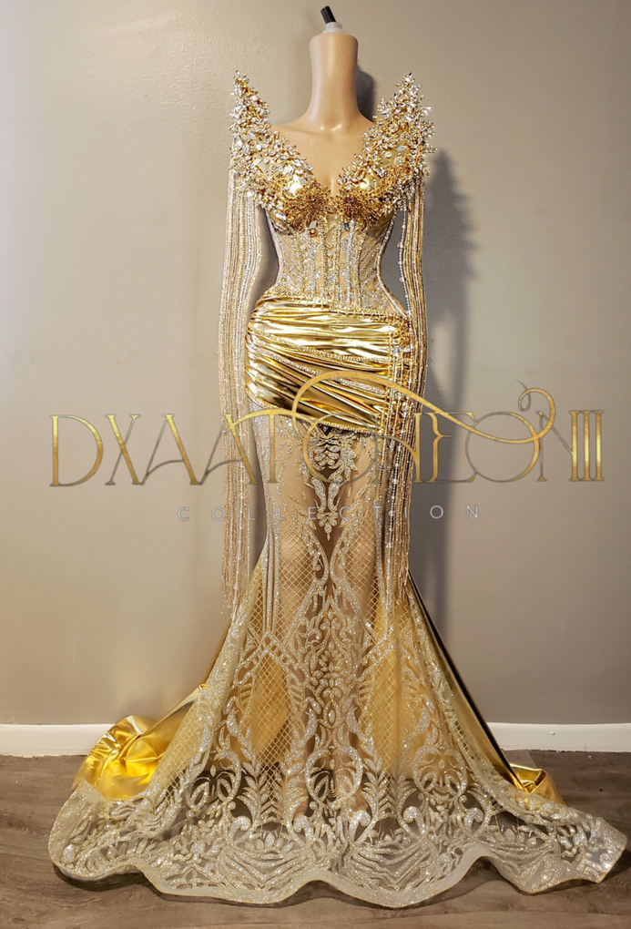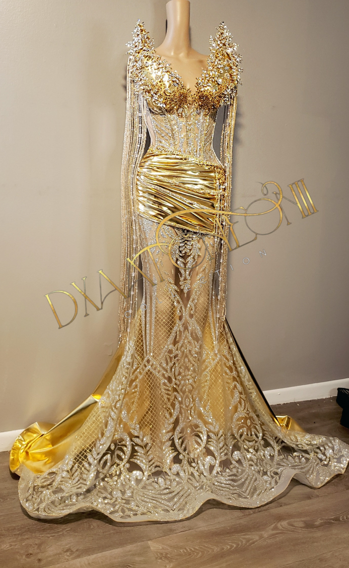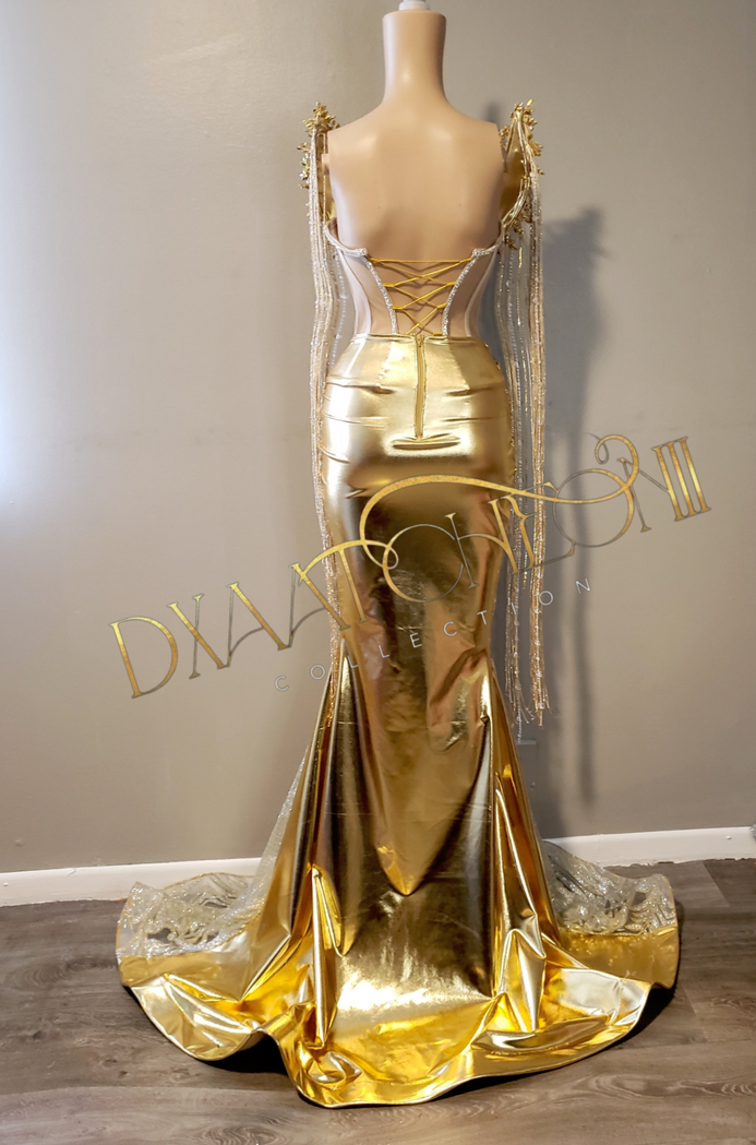 Custom gold on silver corset gown with gold & silver diamonds and elegant draping, 3d pointed bust piece with beaded diamonds and mirror pieces and knee length fringe. Back is lace up.
