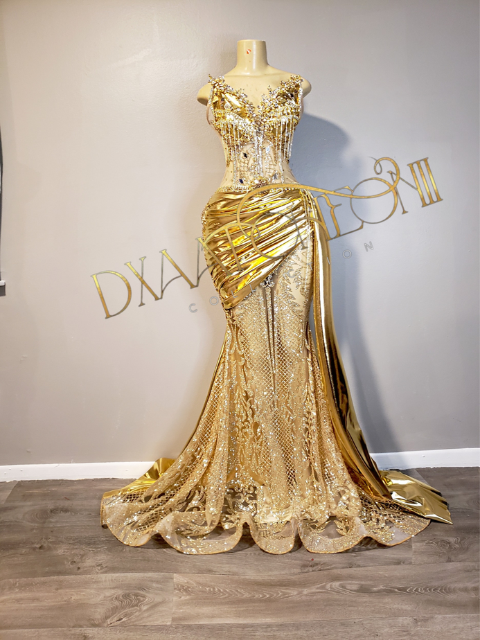 Custom gold on gold corset gown with gold diamonds and elegant draping, Back is laceup.