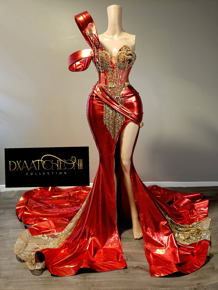 Custom red 3d corset with gold crystals mirror pieces and a slit. Back is lace up.