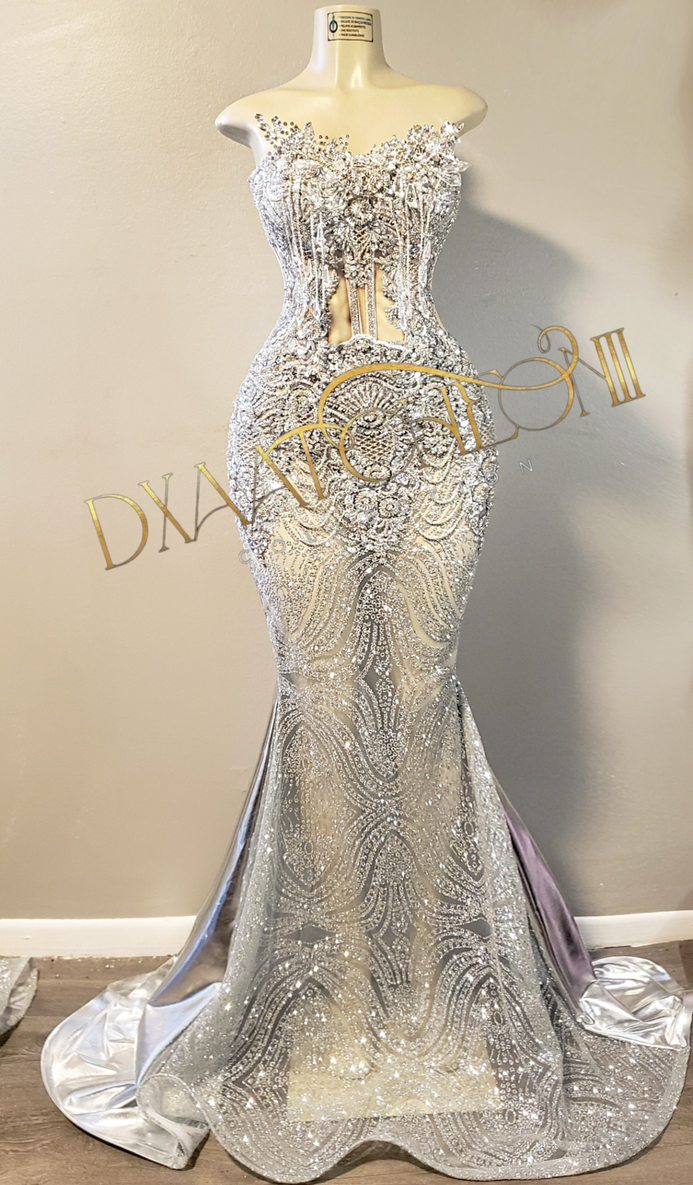 Custom silver beaded crystal corset gown. With 3d crystal bust and chandelier crystals and rhinestone fringe. Back is metallic silver and lace up.