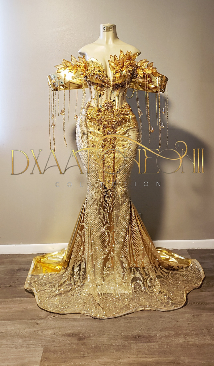 Custom gold corset gown with rhinestone and extra long beaded fringe and hanging chandelier crystals. Crystal embellishments add for perfect touch. Back is metallic gold and is laceup.