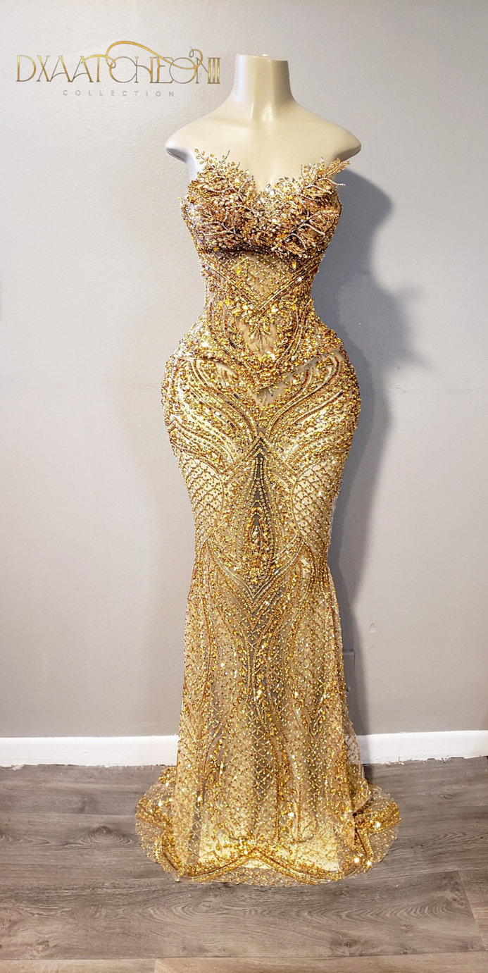 Beautiful full beaded gold corset gown. With 3D bling. Lace up back.
