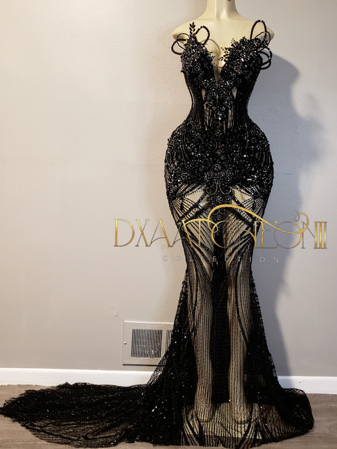 Show up and show out in the custom beauty. Full beaded black corset gown. With 3D bling and black crystal bling. Bottom is mermaid and back is lace up.