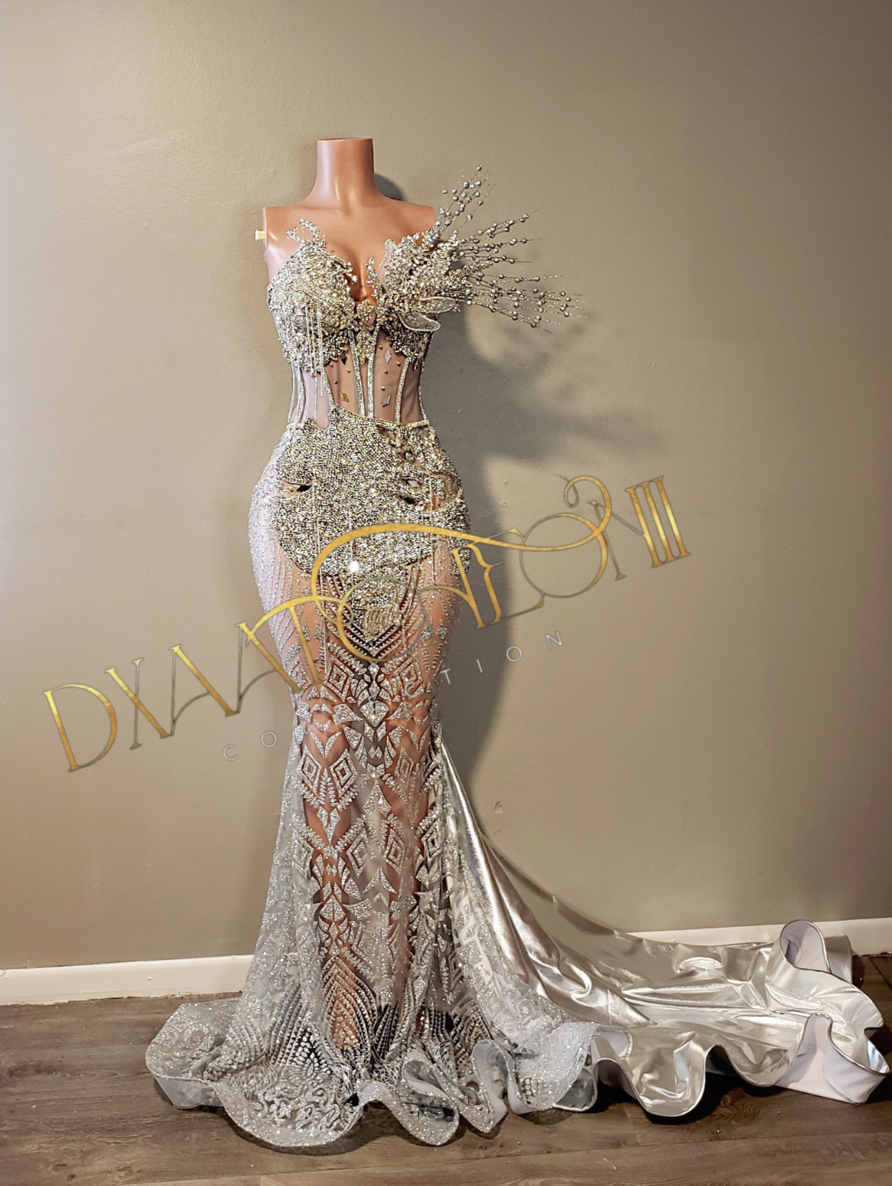 Custom silver corset gown with silver diamonds, left bust has structured crystals, crystals flower petals, and glitter structured points. Custom  crystal bodice. Back is lace up.