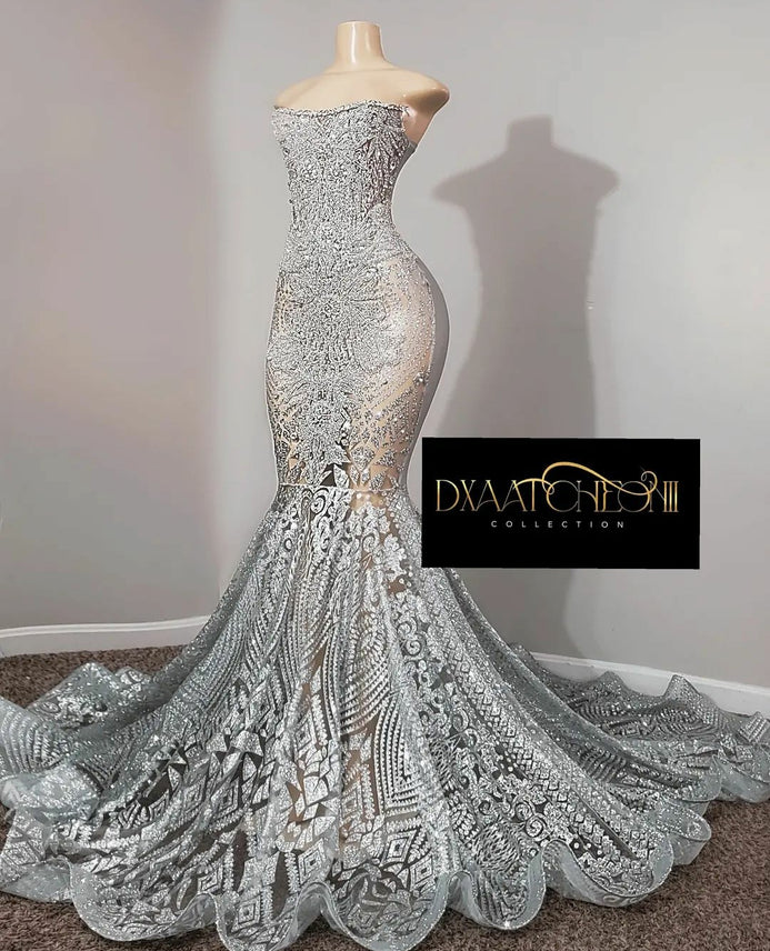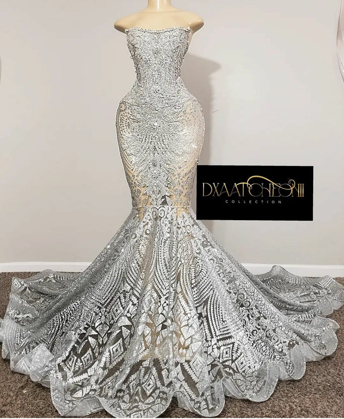 Corset structured gown with silver custom bling. Mermaid train. The back is stretch fabric with a zipper. (Not laced up).
