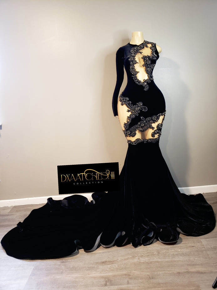 Black on black velvet mermaid gown with custom bling for the it girl. This gown is one sleeve with back open.