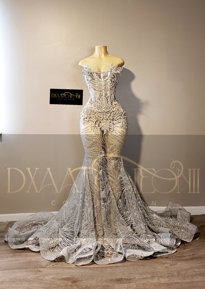 Corset gown with silver custom bling. Mermaid train. The back is silver metallic stretch fabric with a zipper. (Not laced up). This gown can be lined from waist to knee free of charge. (So no skin is showing).