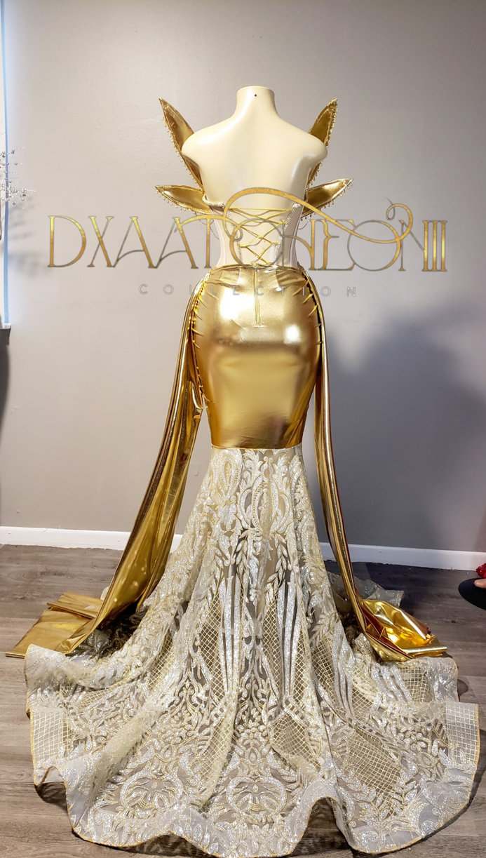 Custom gold on silver corset gown with gold & silver diamonds and elegant draping, 3d bust piece with beaded diamonds and mirror pieces. 2 Non-detachable sidetrains. Back is lace up.