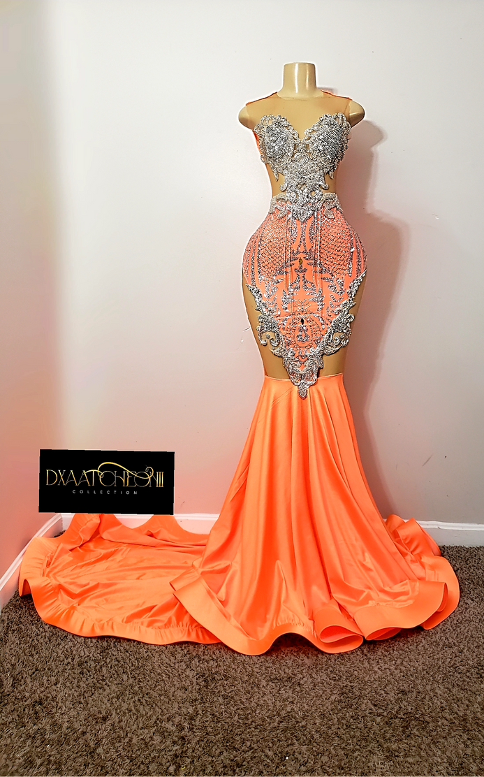 Neon orange and silver handcrafted bling mermaid train gown full back with zipper.