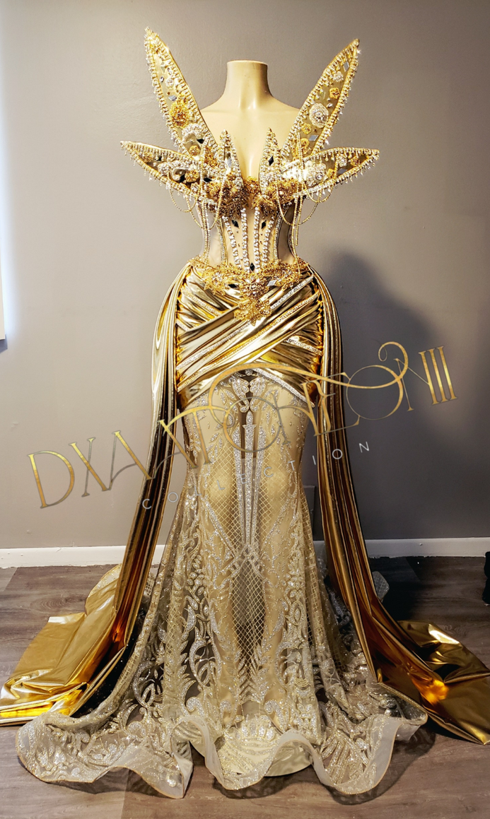 Custom gold on silver corset gown with gold & silver diamonds and elegant draping, 3d bust piece with beaded diamonds and mirror pieces. 2 Non-detachable sidetrains. Back is lace up.
