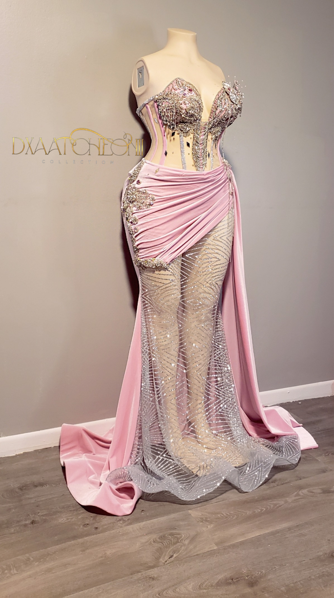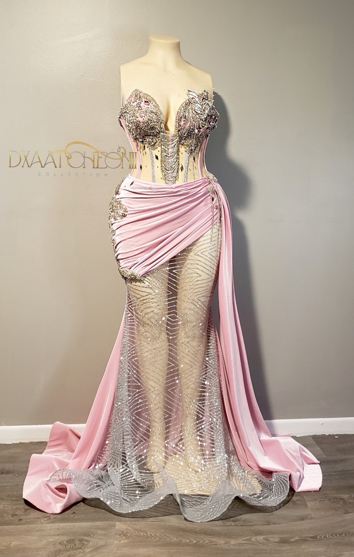 Pink corset gown with 3d bling,gems, drapping and side train.