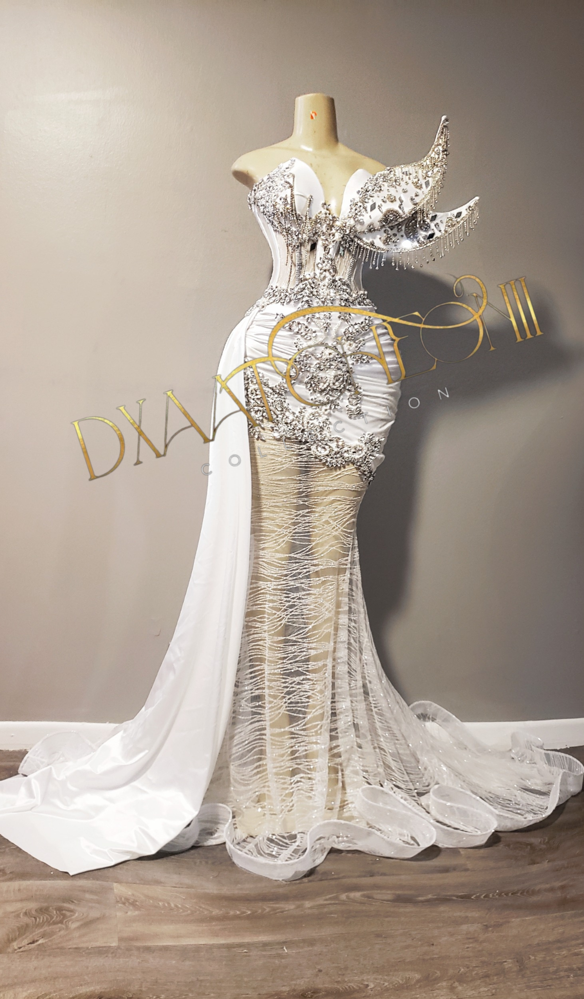 Custom white lace corset gown with silver and white crystal lace, mirror pieces and a slit. Back is lace up.