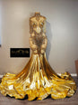 Custom gold on gold gown with custom bling and beaded fringe and mermaid train. Back is full with zipper.