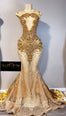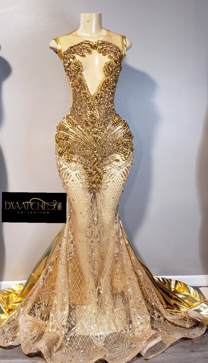 Gold on gold mermaid gown with upper open back.
