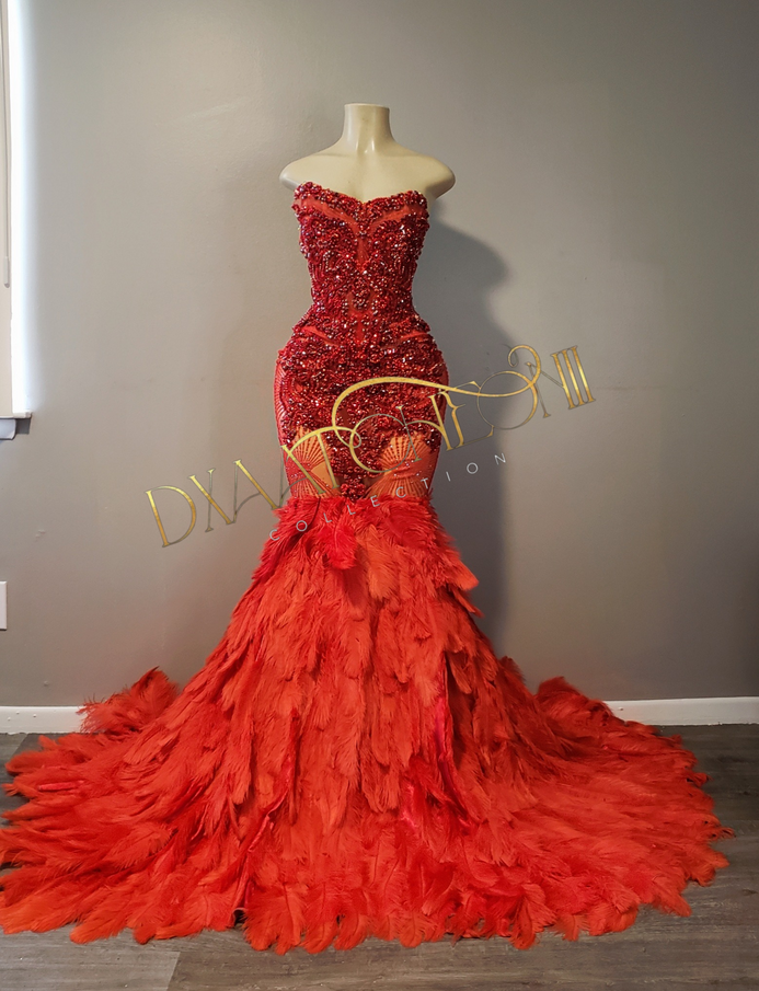 Red corset ostrich feather mermaid gown with crystals bodice embellishments over red glitter mesh. Back is zip up not lace up.