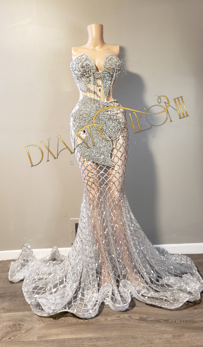 Custom silver on silver corset mermaid gown. With crystal bling. Back is lace up.